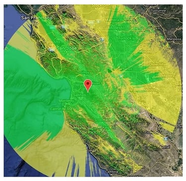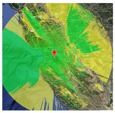 The VHF and UHF voice repeater coverage ranges to the west to the Monterey Bay area, to the north to Santa Cruz and Hwy-101 areas, to the east to Pacheco Pass and into portions of the Sierra Mountain Range, and to the south, deep into the Salinas Valley to King City area and beyond.
